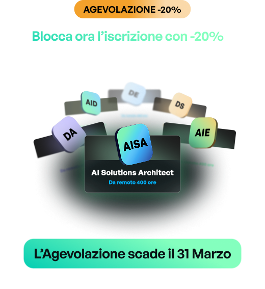I nostri Master Professionali uniscono la flessibilità della formazione online con la qualità di un percorso strutturato, utilizzando l’intelligenza artificiale stessa per permetterti di formarti meglio e in fretta. Lo studio è organizzato in 11 corsi on-demand, ognuno suddivisi in più moduli di teoria, pratica ed esercitazione. Le singole lezioni durano appena 10 minuti per mantenere alta la tua attenzione, puoi seguirle quando e dove vuoi durante la tua gioranta. Al termine di ogni modulo di un corso il tuo livello di comprensione verrà valutato tramite un deep test, un sistema di testing adattivo basato sull’intelligenza artificiale che evidenzia le tue lacune e ti aiuta a colmarle con spiegazioni personalizzate. Inoltre, Ogni settimana organizziamo sessioni live facoltative di supporto con i nostri Coach e di approfondimento con i principali esperti italiani su diverse tematiche legate a Data e AI.